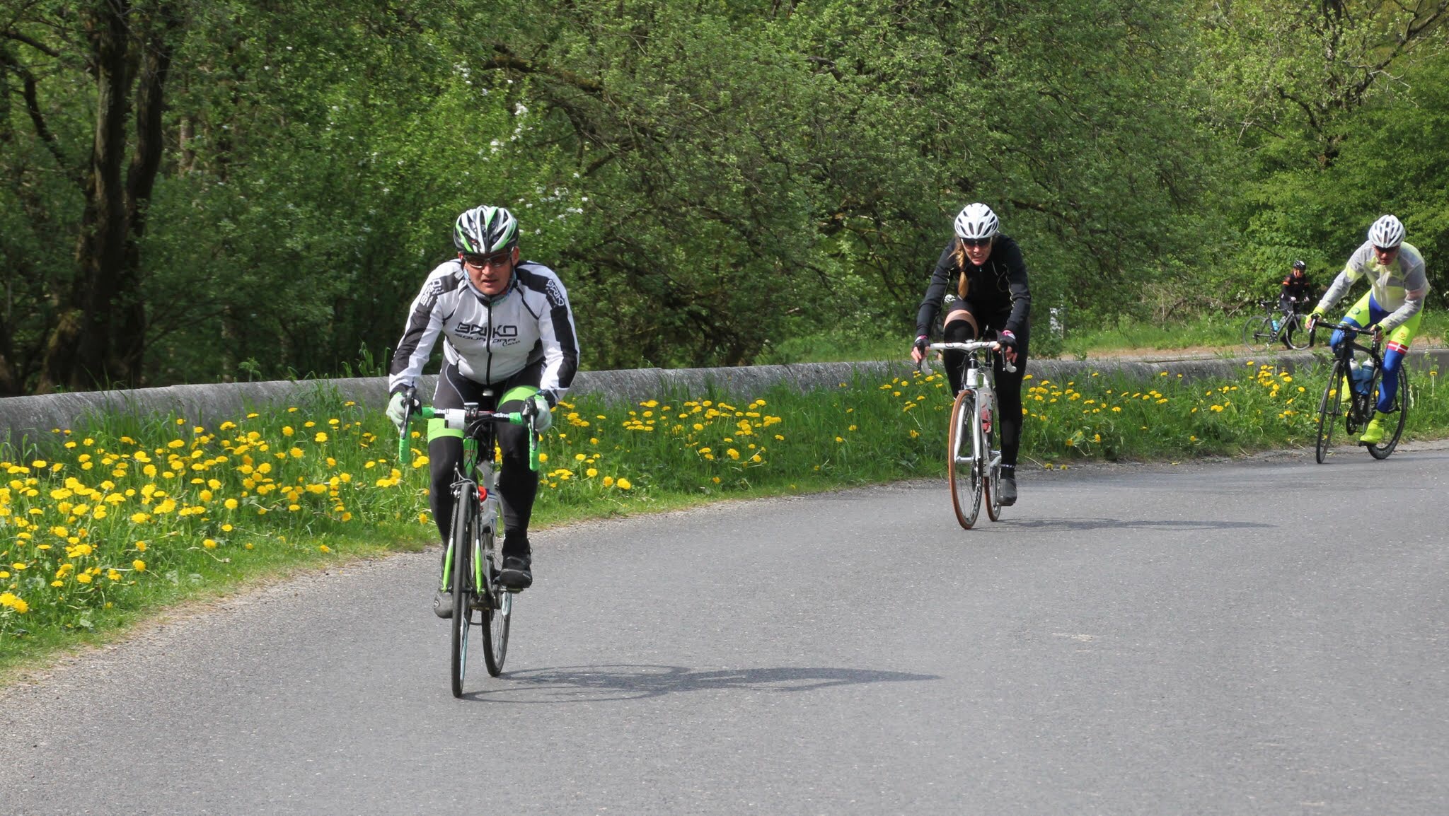 Vi får stillet til start og er klar kl 07.51 og forude venter 8-9 timer i sadlen, første bakke kommer allerede efter to km, så der er ikke tid til at blive varm, det er lige på og hårdt. Men så er man i gang , for varm det bliver man på første bakke. Vi er lige ved at kører forkert efter de første 3 km, det havde sgu været en dårlig start, men i samarbejde med to damer fra Taastrup Motions-cykling, fik vi undgået fejlen og kom rigtigt ind på ruten. De to Tina og Doris, endte vi med at følges med rundt hele vejen. Det er det hyggelige ved løb, finde og møde nye mennesker, hjælpe hinanden rundt og bidrage til at alle har en god oplevelse.