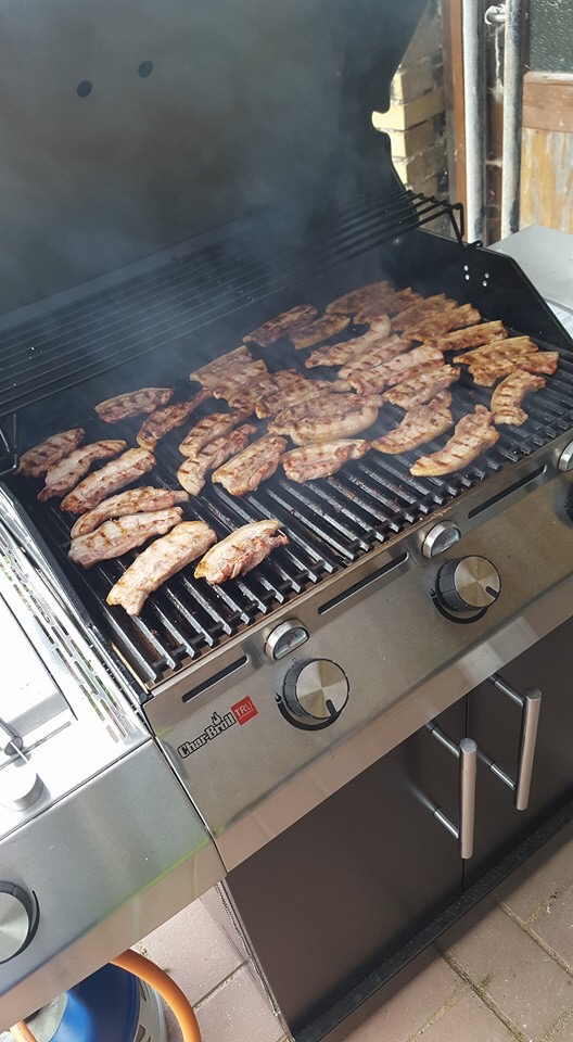 Men med lidt besvær fik vi plads til hele (det meste siger Helle) og turen kunne gå p tværs af Sjælland og mod Fyn og Munkebo. Da jeg havde haft fødselsdag dagen før, overraskede Rasmus og Katja mig med stegt flæsk og persillesovs BONUS! Specielt da flasken blev lavet på grill, dobbelt BONUS 😊